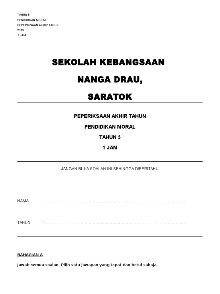 Soalan Peperiksaan Pendidikan Moral Tahun 5 Akhir Tahun Pdf